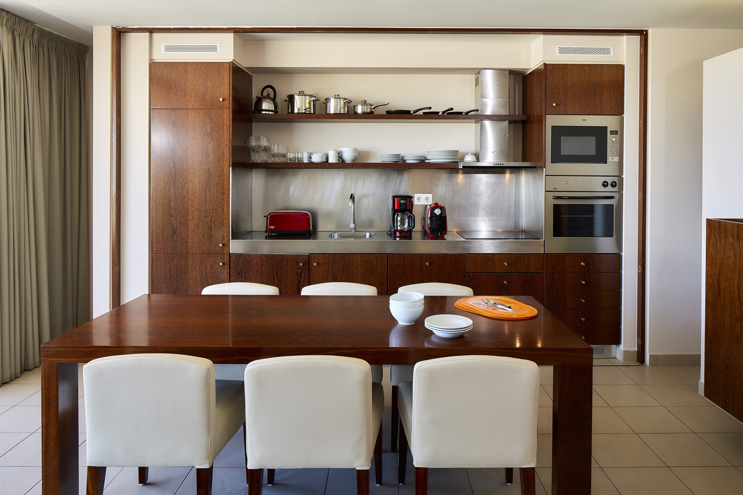 A kitchenette, de vitrocerâmica, está equipada com frigorífico, microondas, forno, congelador, máquina de lavar roupa, máquina de secar roupa, máquina de lavar louça, louça/talheres, utensílios/cozinha, cafeteira, torradeira, jarro eléctrico e máquina de sumos.