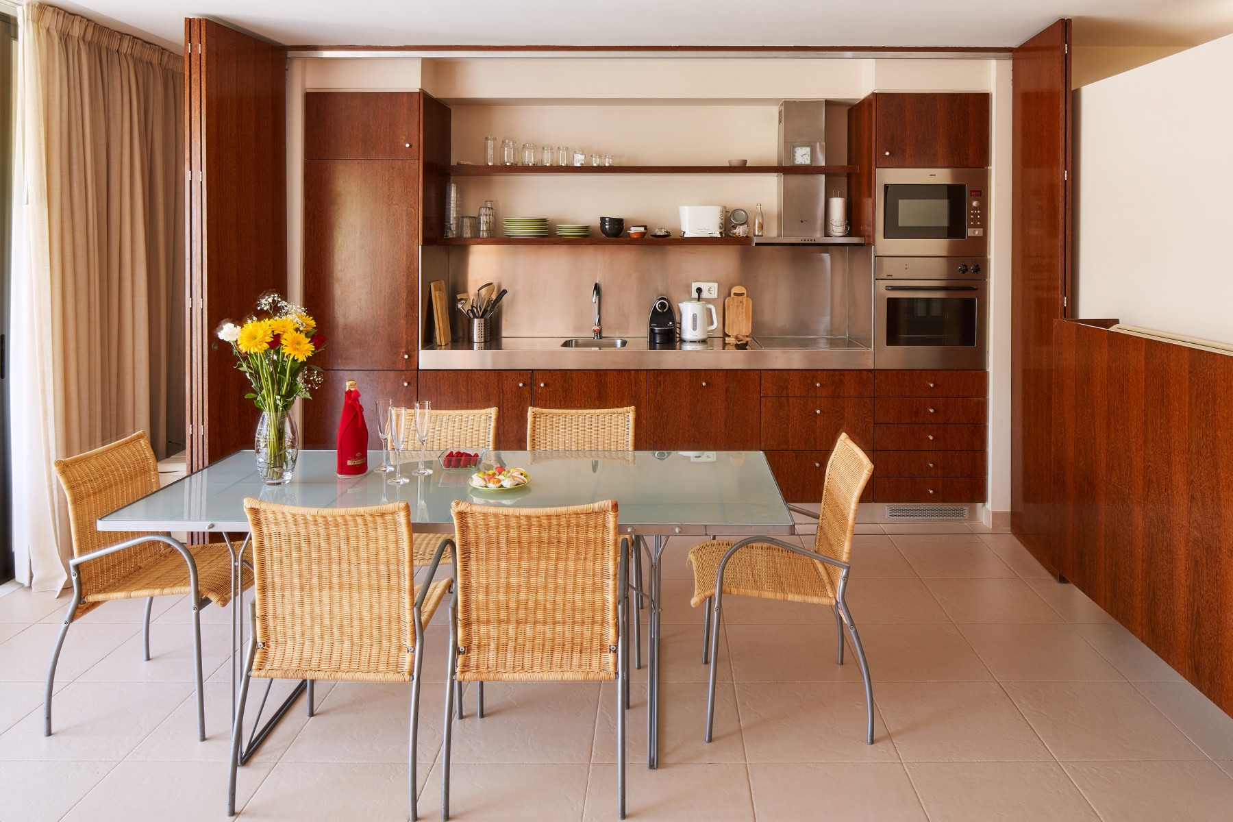 La cuisine américaine, à vitrocéramique, est équipée avec réfrigérateur, micro-ondes, four, congelateur, lave-linge, sèche-linge, lave-vaisselle, vaisselle/couvert, ustensiles/cuisine, cafetière, grille pain et bouilloire.